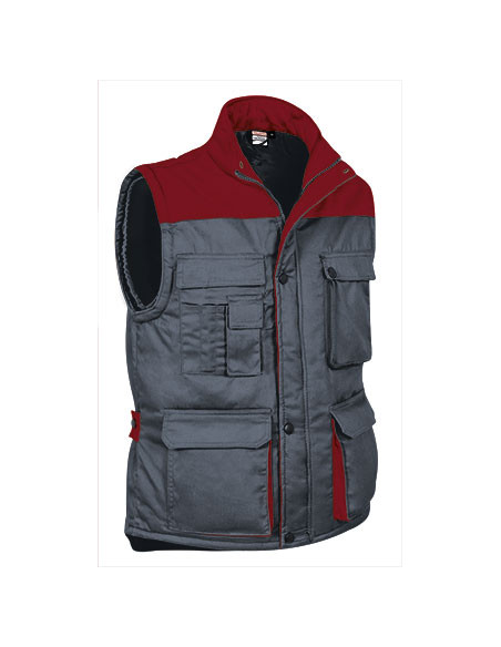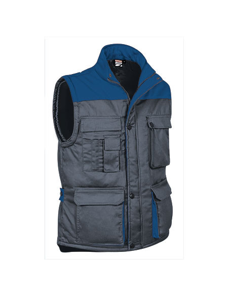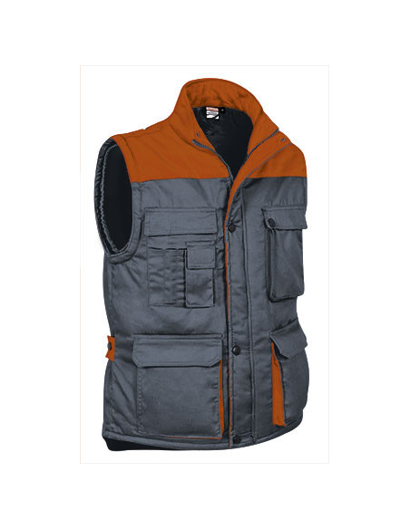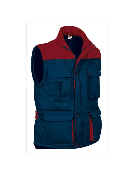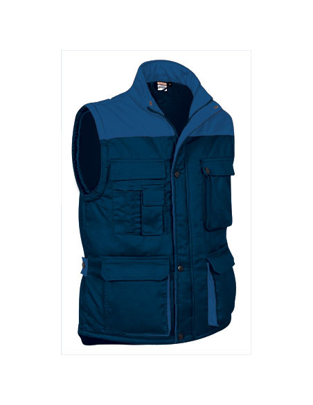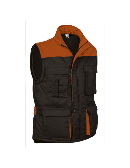 Chaleco multibolsillos en colores combinados, confeccionado en tejido de sarga con relleno acolchado y forro interior.