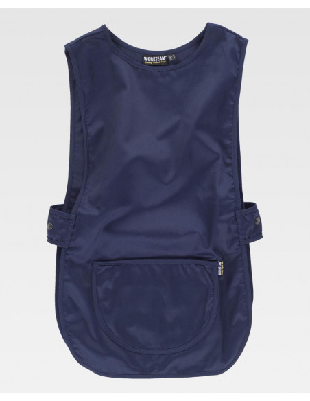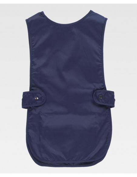 Casulla corta de cuello redondo. Piezas laterales ajustables con doble corchete en la cintura. Un bolso central redondeado. Ribeteado con bies al tono.